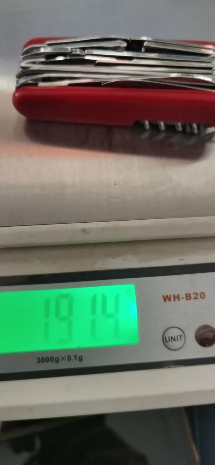 Pocket knife with 17 functions: Large blade, small blade, corkscrew, can opener with small screwdriver, bottle opener with screwdriver and wire stripper, punch hole, key fob, scissors, multi-purpose hooks and wood saw