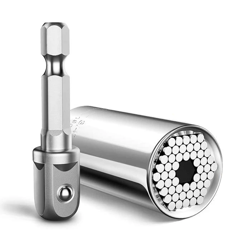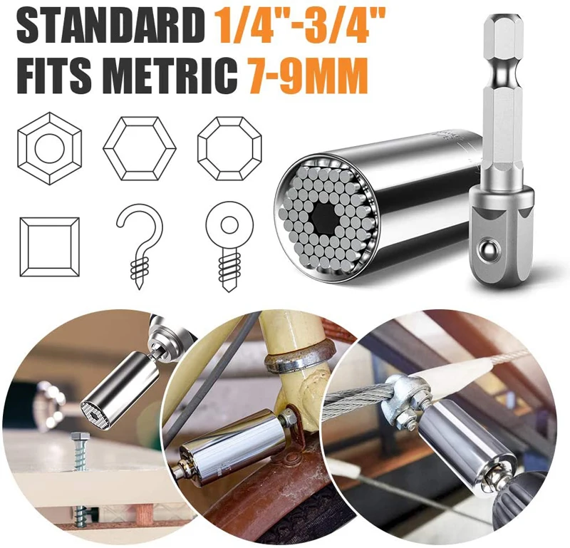 Clever and Useful Tools Ever: Universal socket grip is equipped with power drill adapter, easy connect with most electric drills, electric screwdrivers and manual ratchet set. The brilliant universal socket instantly adjust to grip most metric, wing nuts, broken nuts, stripped nuts, eye bolts, square nuts, hexes and most irregular shape. This magic universal socket grip is must have tool for both the professional and the average person. Great addition to your toolbox, cool gift for men
